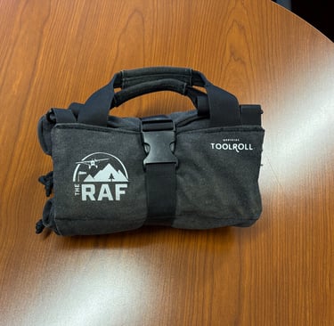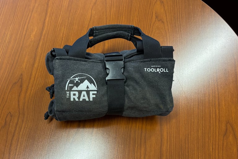 All of this, surprisingly, comes in at about six to seven pounds total. Not insignificant, but not excessive either—especially when you consider what it can save you. The entire kit packs neatly into a roll-style tool bag, compact and organized (courtesy of the RAF!) One photo shows everything laid out—the full inventory in plain view. The other shows it packed, rolled up, and ready to go. It’s a small footprint for a lot of capability.